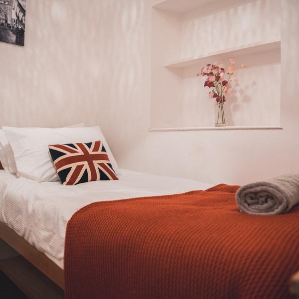 A spacious upstairs bedroom with two single beds and luxury bedlinen.